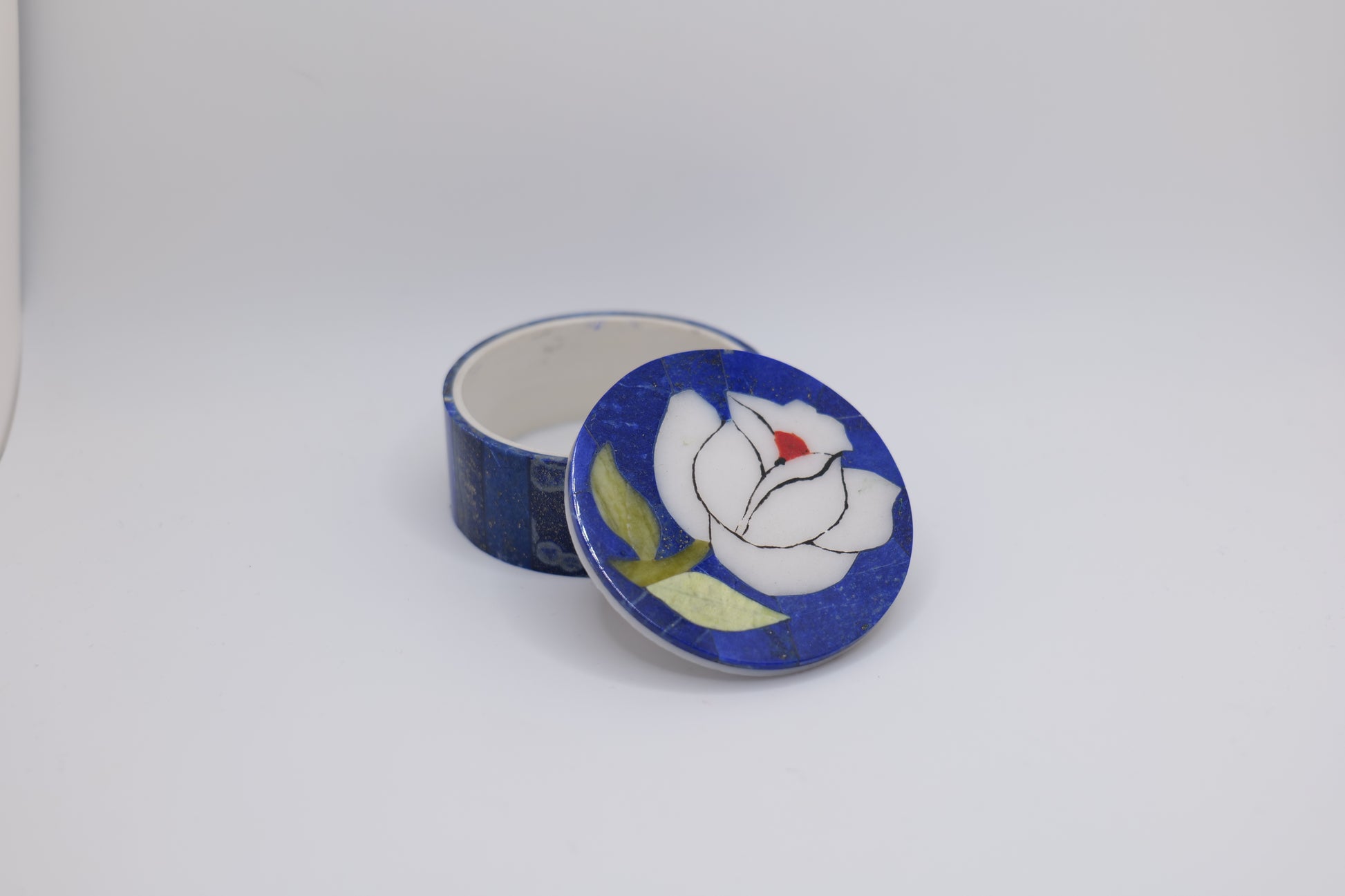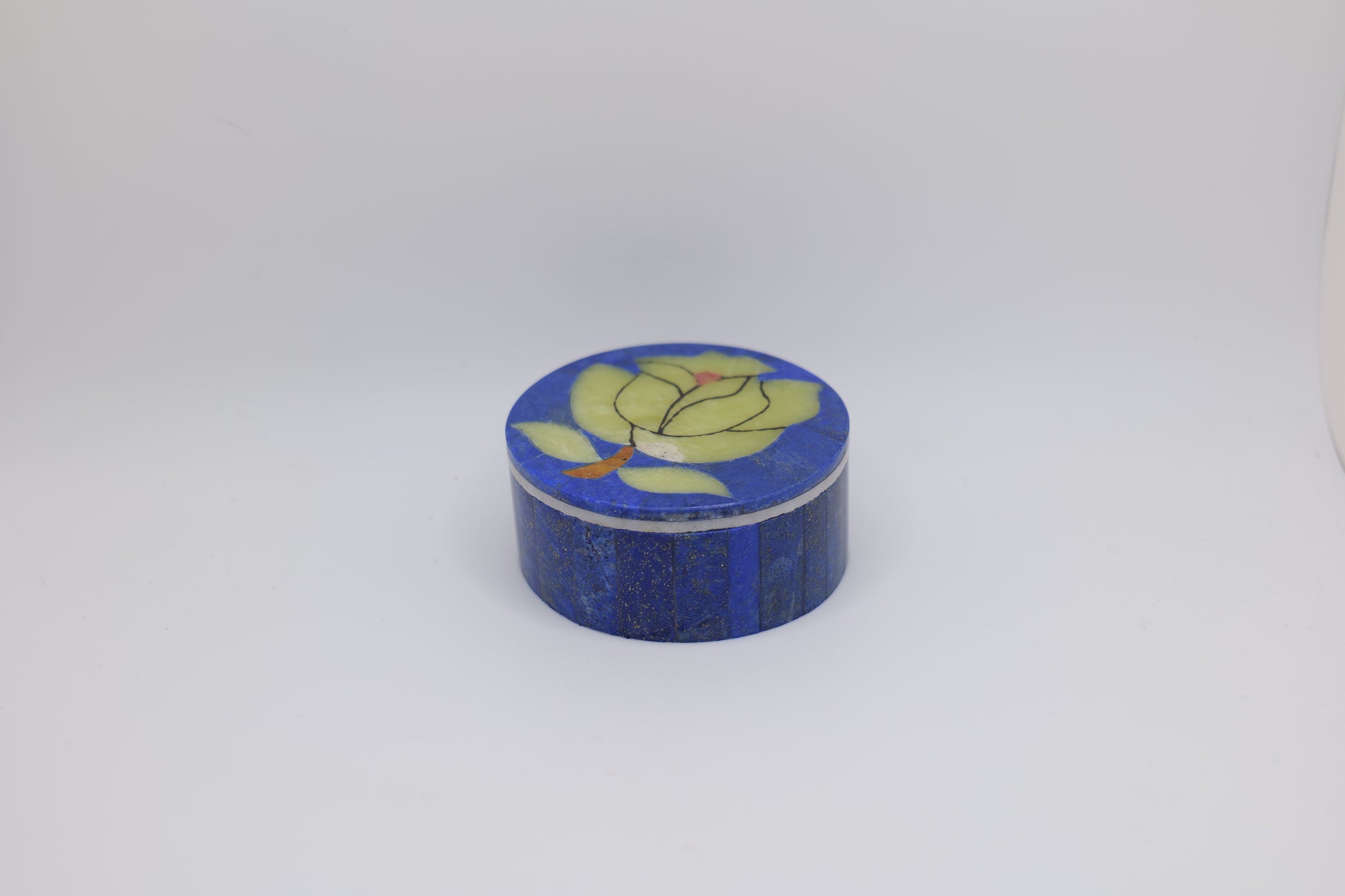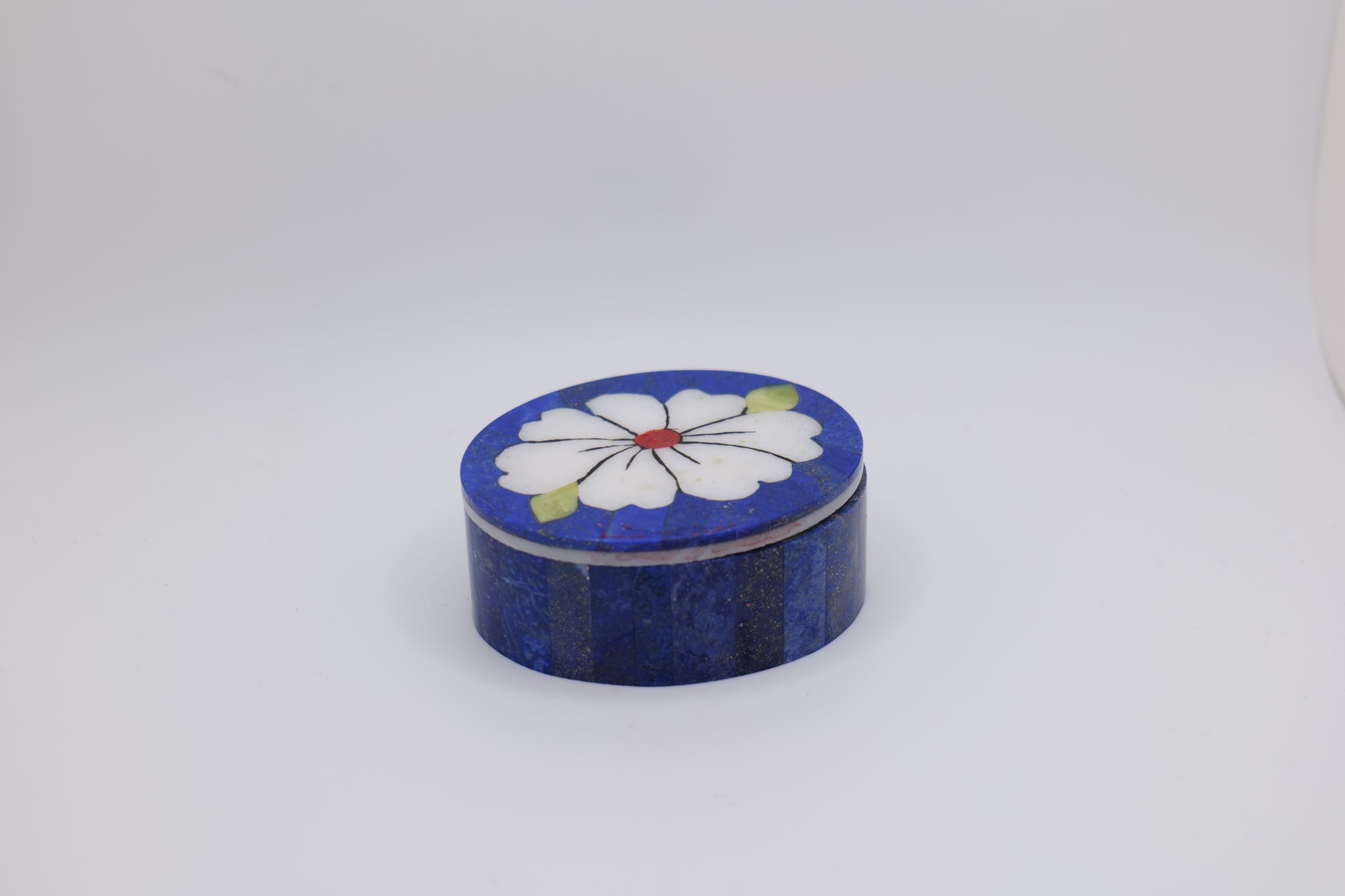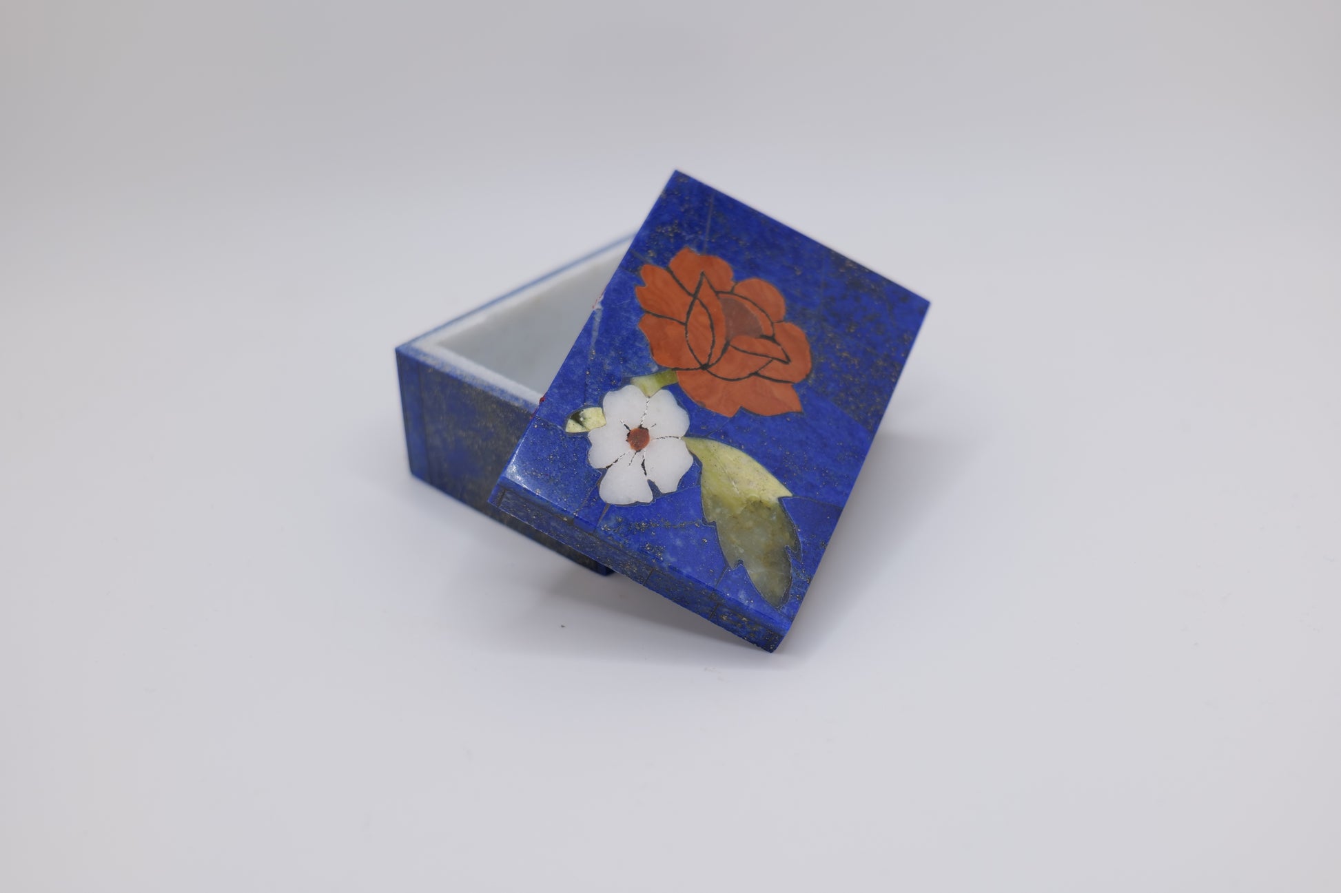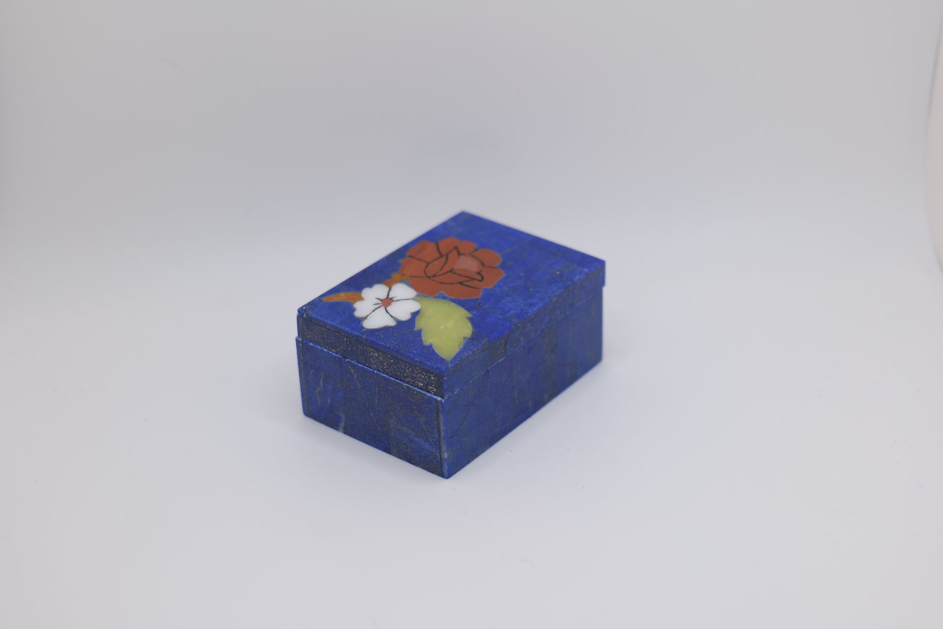 These exquisite boxes are handcrafted from natural lapis lazuli stone, sourced from the mountains of Afghanistan and inlaid with colorful floral designs using traditional techniques. Each piece is unique, showcasing different shapes and hand-painted patterns with natural golden pyrite inclusions, giving them rich and vibrant character. These boxes are perfect for storing jewelry, keepsakes, or as a decorative gift.