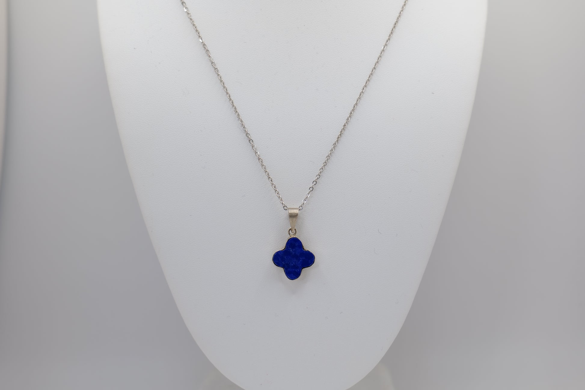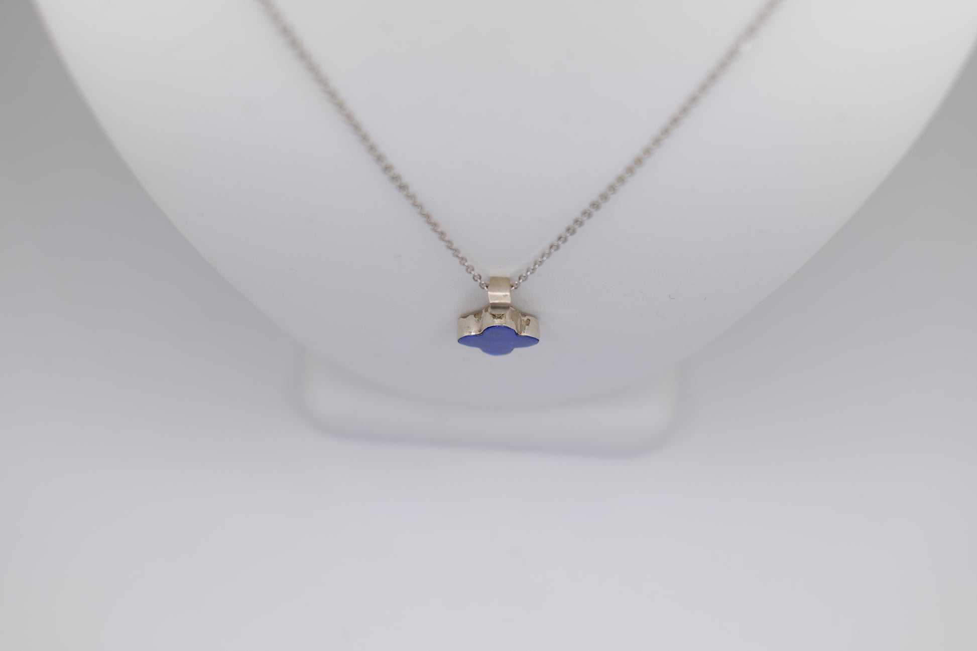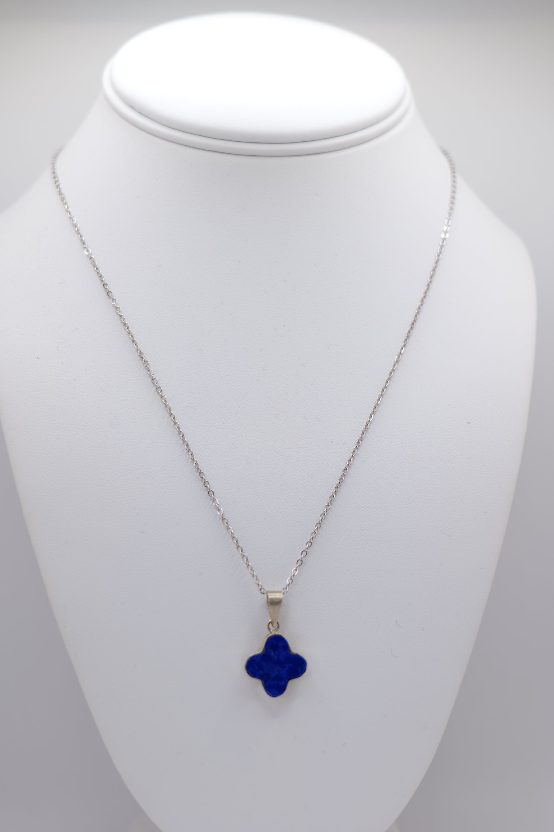This dainty lapis lazuli necklace emphasizes the striking blue of the stone through a pretty floral cut. The lapis lazuli stone was cut from the mountains of Afghanistan and handcrafted by skilled local artisans. It's an elegant necklace to add a simple charm to your outfit.