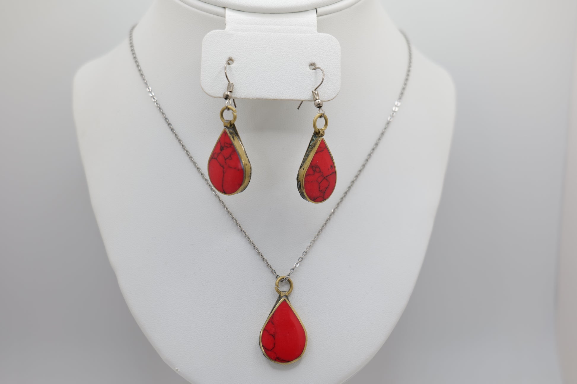 This jewelry set a matching pair of earrings and necklace each made with a fiery red stilestone cut into a teardrop shape and encased in bronze. Buy this set today and add a dramatic flair to your jewelry collection! Each stone was cut from the mountains of Afghanistan and handcrafted by skilled local artisans.