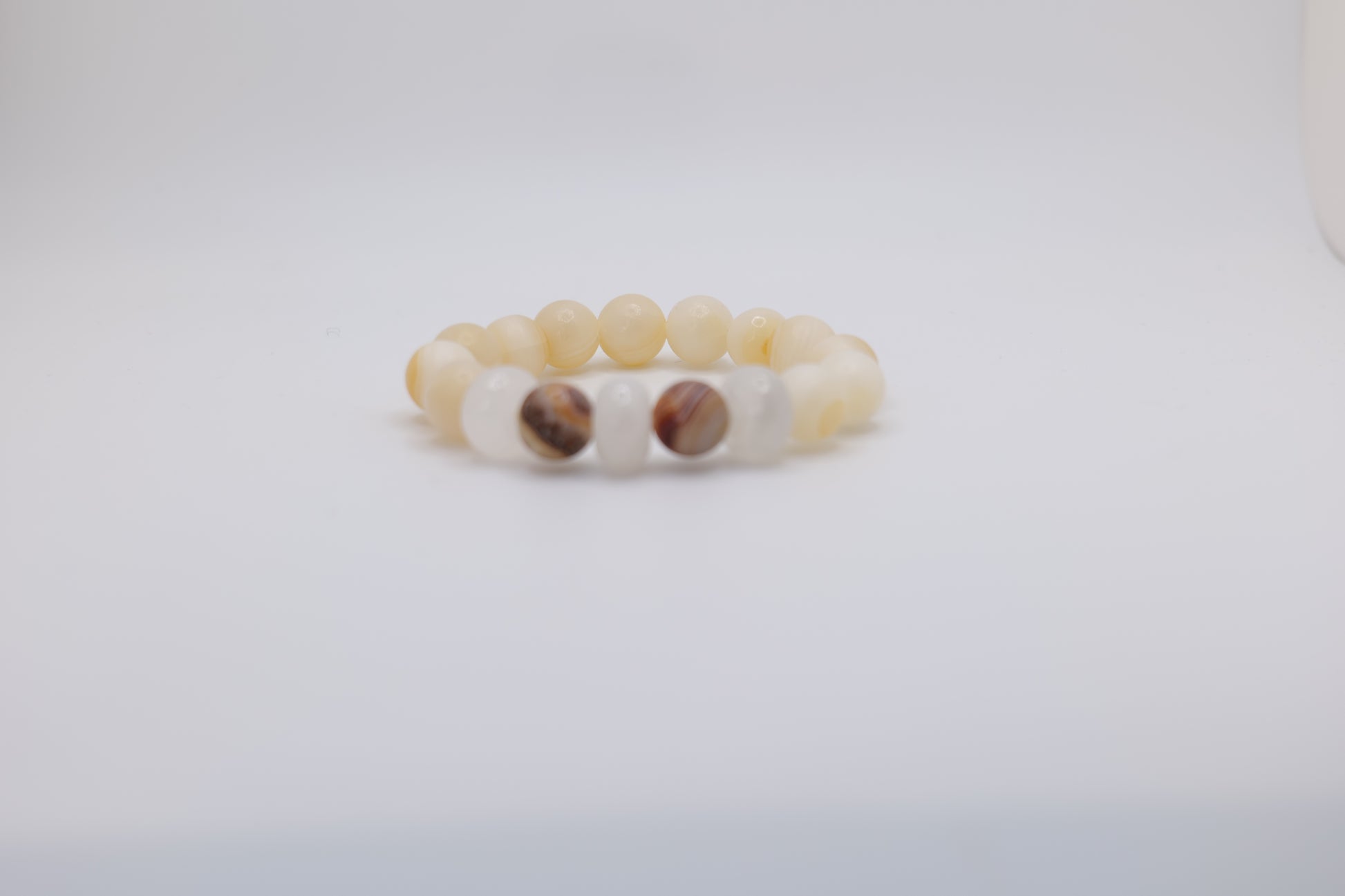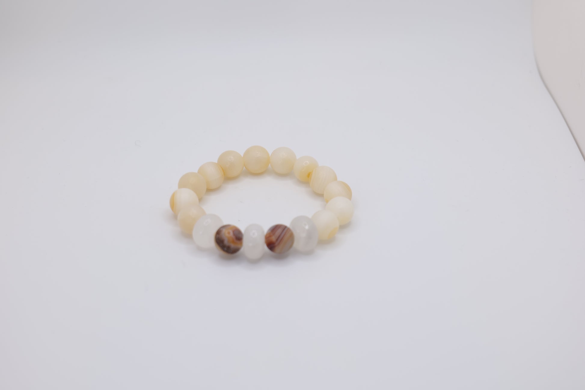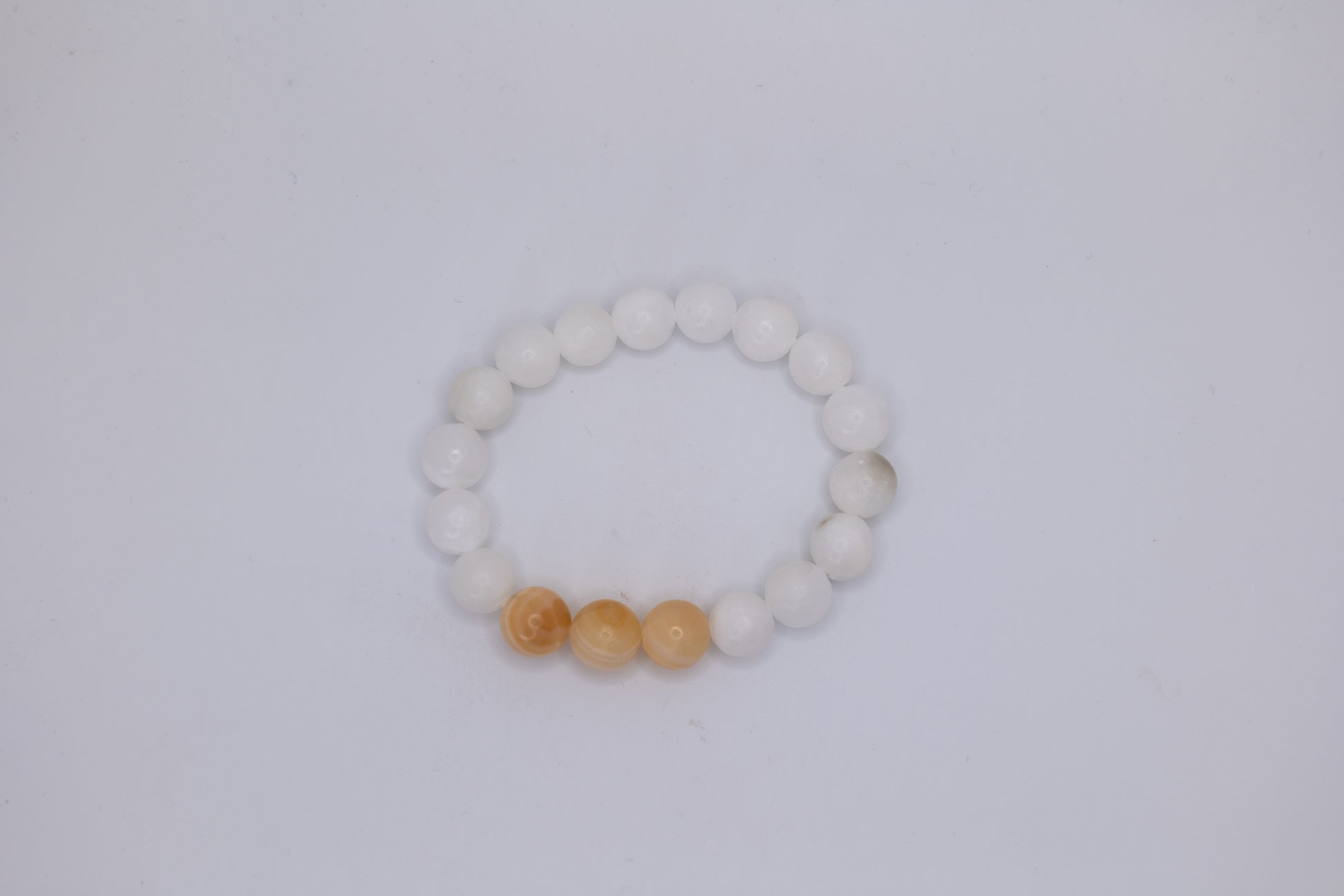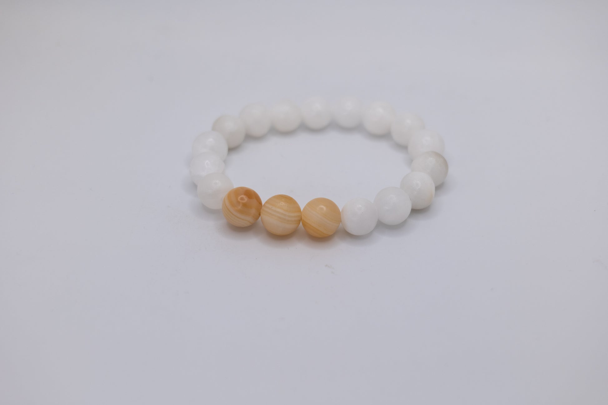 These beautiful bracelets are made with white marble stones and striking onyx ones as eye-catching centerpieces. We have three different styles of this bracelet. The first style is made of clear white marble stones and a single onyx one as the showpiece in the center. The second style is made of white marble stones that match the warm browns and patterned nature of the two onyx stones highlighted in the middle of each bracelet. The third style is also made of clear white marble stones, but with three onyx ones in the middle. These bracelets add a simple but elegant touch the wearer's outfit. Each bracelet was lovingly handcrafted by skilled artisans in Afghanistan.